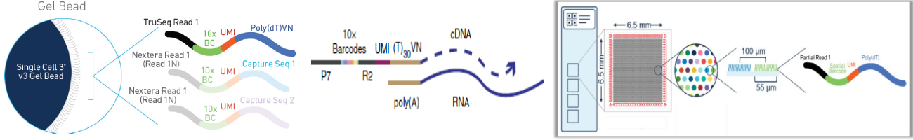 10x Genomics空間轉錄組用于文庫構建的每張載玻片上有四個(gè)捕獲區域,每個(gè)捕獲區域的大小為6.5×6.5mm,包含5000個(gè)被條形碼標記的點(diǎn)(barcoded spots),每個(gè)點(diǎn)的直徑為55 μm,點(diǎn)和點(diǎn)之間中心的距離為100 μm,并且每個(gè)點(diǎn)都有一個(gè)唯一的barcode序列。