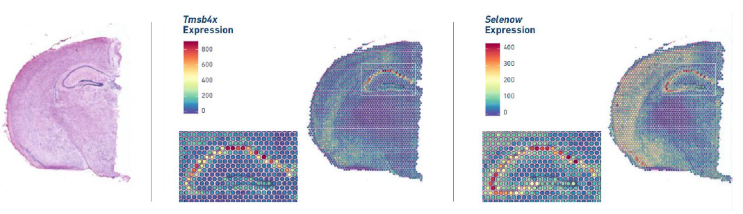 A代表組織切片的HE染色。B和C分別代表海馬組織的標記基因Tmsb4x和Selenow基因的空間表達情況,結果顯示這兩個(gè)基因在海馬體中顯著(zhù)高表達,符合已知的基因表達模式