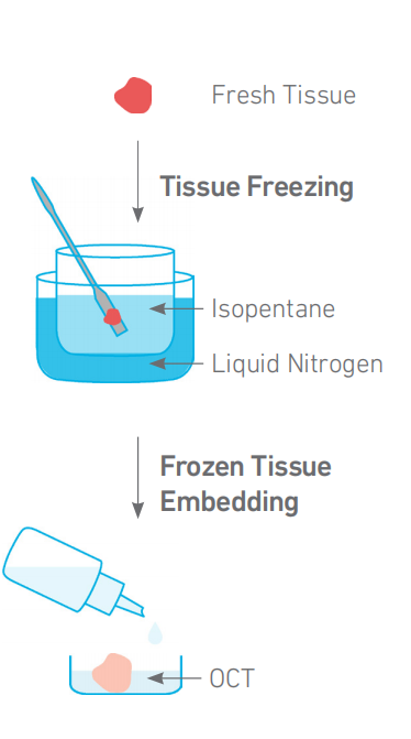 實(shí)驗流程為:新鮮組織取樣-異戊烷凍存-OCT包埋-冷凍切片-染色-顯微鏡觀(guān)察-建庫測序 需要客戶(hù)準備:新鮮組織取樣–異戊烷凍存(保存或運輸)–OCT包埋–保存或運輸 客戶(hù)在制備樣本時(shí),需要準備3份樣本(至少2份),每塊組織樣本不宜過(guò)大(長(cháng)寬高約0.8 cm )