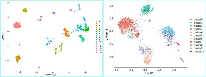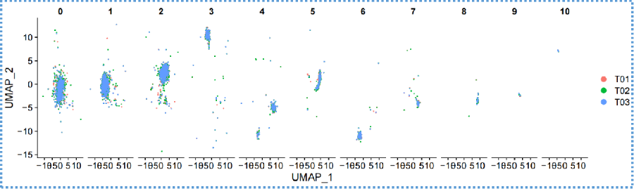 將相同的PBMC細胞懸液分3份,通過(guò)3個(gè)不同實(shí)驗人員,用3臺百創(chuàng )DG1000儀器,獨立進(jìn)行單細胞測序,得到了幾乎一致的細胞聚類(lèi)分群結果,證明百創(chuàng )DG1000具有很好的可重復性及穩定性。