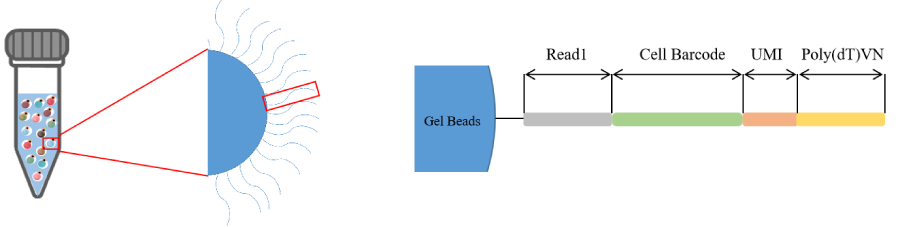 種類(lèi)約為88萬(wàn)種,每個(gè)膠珠之上有千萬(wàn)級的探針,每條探針包括四個(gè)部分,通用測序引物R1,cell barcode,UMI,poly(dT)VN ,這里我們設計了更長(cháng)的CB有54個(gè)bp,更長(cháng)的CB可以更好的去兼容三代測序,尤其是ONT測序,可以提升識別效率。