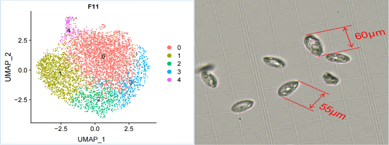 細胞直徑在55-60μm的原生動(dòng)物,分別進(jìn)行了DG1000與主流平臺的測試,主流平臺未能成功捕獲,DG1000不但捕獲成功同時(shí)得到了客戶(hù)比較認可的數據,DG1000細胞直徑成功兼容到60μm,為單細胞測序獲得更多細胞類(lèi)型提供可能。