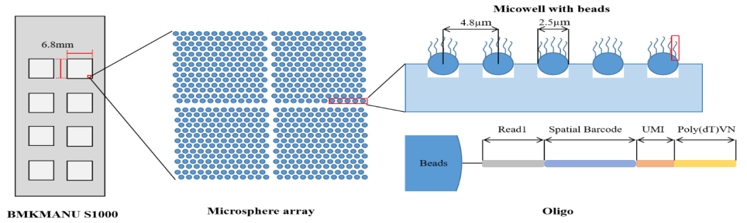 百創(chuàng )S1000(BMKMANU S1000)是由百邁客生物設計并研發(fā)而來(lái)的基于微孔微珠上Spatial Barcode實(shí)現對組織切片mRNA分子捕獲的亞細胞級空間轉錄組芯片。百創(chuàng )S1000可以廣泛應用于生物器官發(fā)育、神經(jīng)科學(xué)、免疫感染、脅迫應激、生物遺傳進(jìn)化等生命科學(xué)領(lǐng)域的研究。