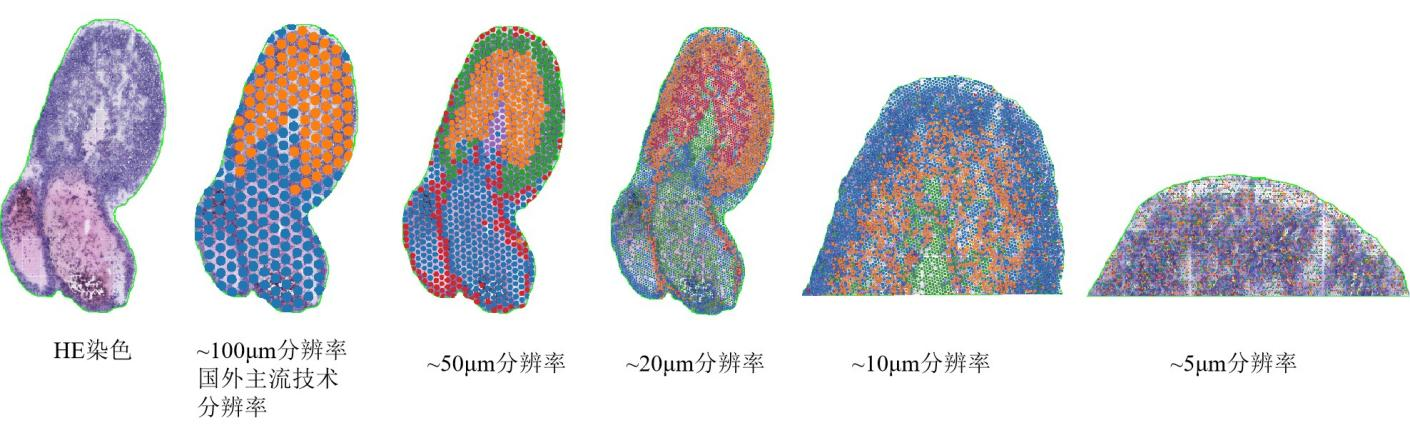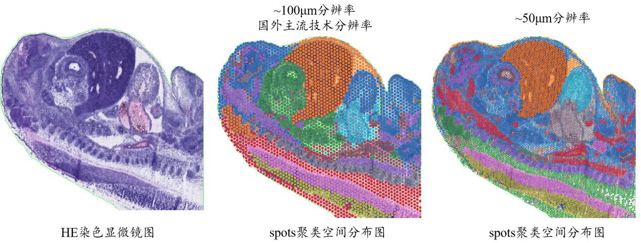 百創(chuàng )S1000分辨率最高可達到4.8μm,相比目前主流空間轉錄組測序芯片精度提高了近400倍,高分辨率下HE染色組織形態(tài)學(xué)與spots聚類(lèi)空間分布圖重合度更高,可以更加精準識別空間基因表達的異質(zhì)性和組織區域的特異性。