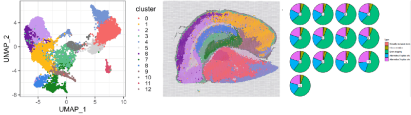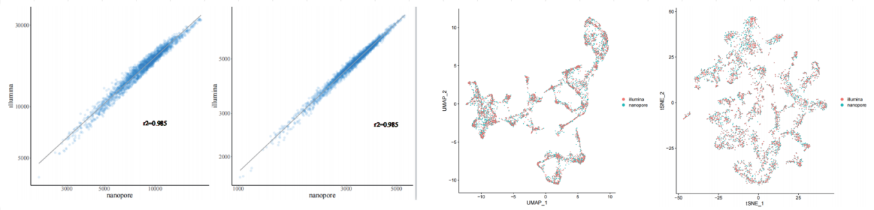 數據的相似性與準確性進(jìn)行了展示與介紹,無(wú)論是二代與三代數據的UMI/Gene counts per spot的相關(guān)性還是tSEN/U-MAP的降維聚類(lèi),都顯示該產(chǎn)品具有非常高的準確性。這充分說(shuō)明百創(chuàng )S1000全長(cháng)轉錄組產(chǎn)品完全可以獨立進(jìn)行數據的拆分與挖掘分析,無(wú)需依賴(lài)NGS數據的校正。
